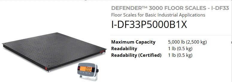 Cân có tải trọng tối đa 5.000 lb (≈ 2.500 kg) với độ chia 1 lb (0,5 kg), phù hợp để cân pallet, vật liệu hoặc hàng hóa nặng. Thiết bị đạt chuẩn NTEP Class III, cho phép sử dụng trong các ứng dụng thương mại yêu cầu chứng nhận đo lường.